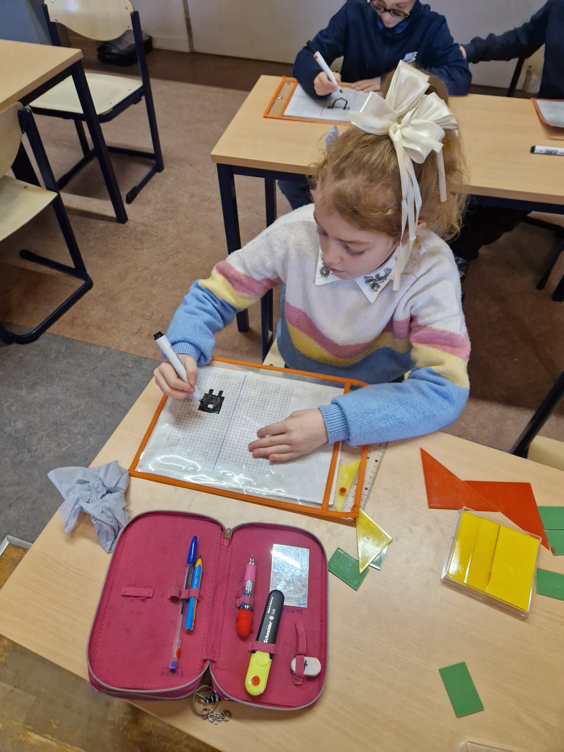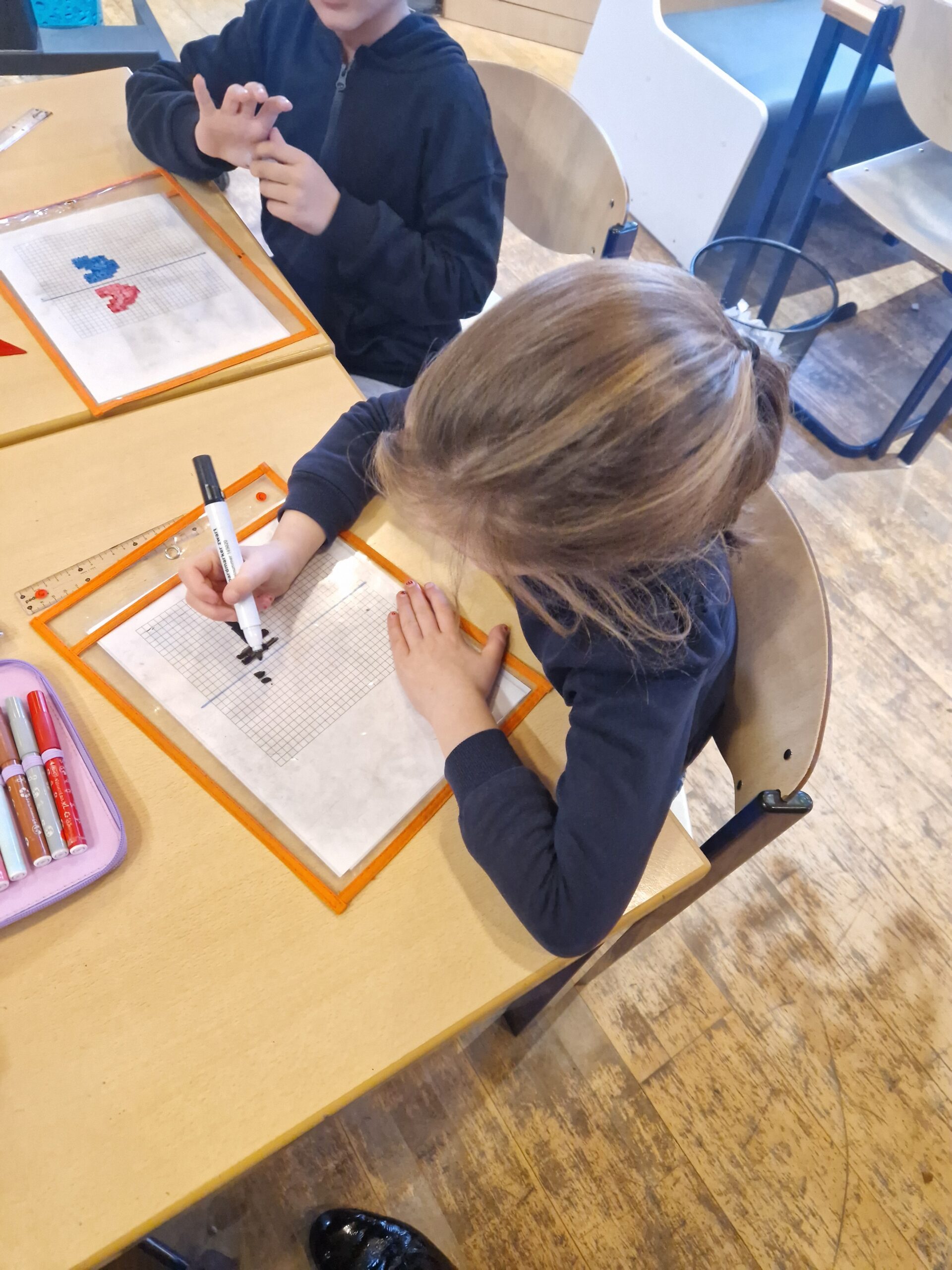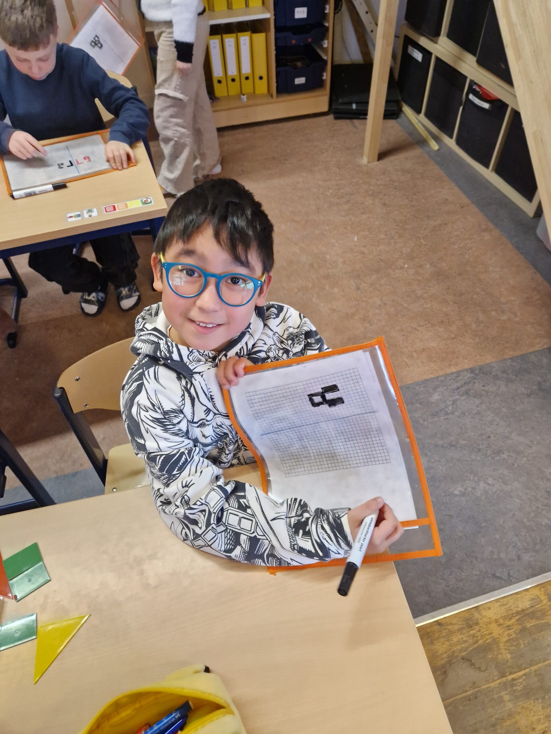 Naast al die sommen herhalen we natuurlijk ook nog andere leerstof van wiskunde. Deze week kwamen de spiegelingen aan bod.